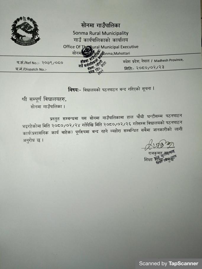 गर्मीको कारण विद्यालयमा पठनपठन बन्द गरिएको सूचना