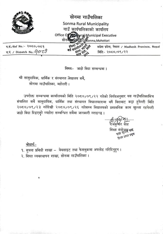 गर्मीको कारण विद्यालयमा पठनपठन बन्द गरिएको सूचना